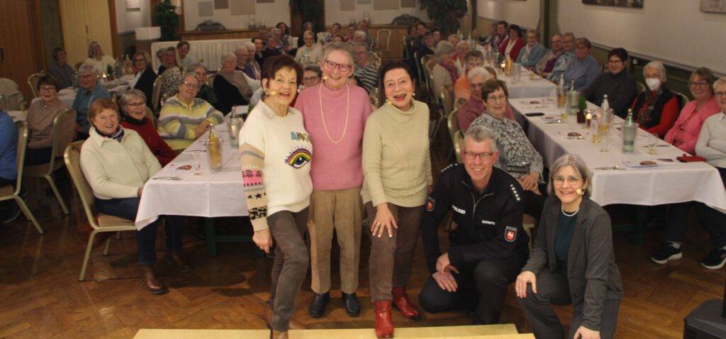 kfd-Generalversammlung Glandorf: Mit einem Theaterstück zum Enkeltrick konnten rund 70 kfd-Frauen auf der Bühne im Saal Herbermann die Betrugsmasche der Schockanrufe verfolgen und viele Fragen stellen. Leider ist dieses Thema im Polizeialltag immer noch sehr aktuell.